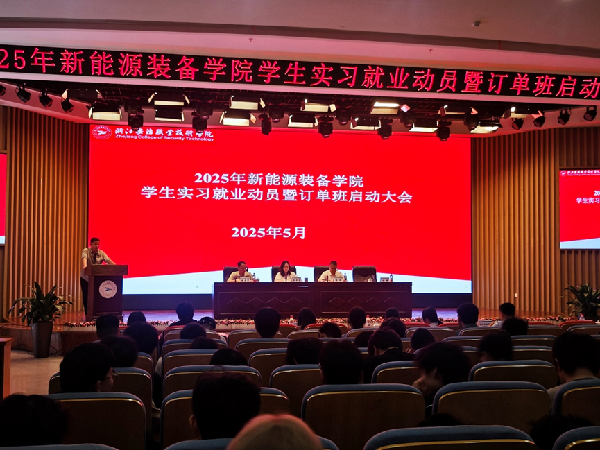 2025年5月7日下午,新能源装备学院在开祖楼报告厅隆重举行了2025年学生实习就业动员暨订单班启动大会。学院党总支书记彭苑茹、院长徐刚、副院长骆正茂、党总支副书记林雄,各专业负责人,以及来自人民电器集团、麦田能源股份有限公司、浙江御风科技有限公司、宝翔科技有限公司、浙江腾腾电气有限公司等多家企业的代表出席了大会。23级各专业学生和24级无人机3+2班学生共同参与了此次活动。