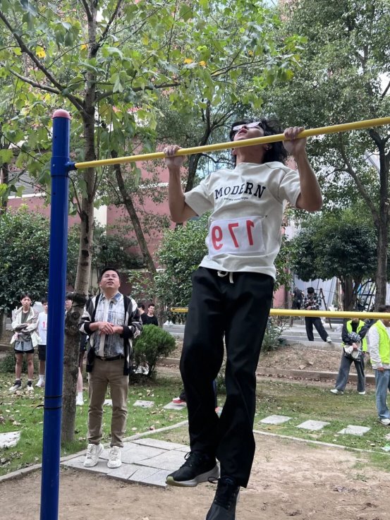 引体向上赛场上,男生们咬紧牙关向上攀升,每一次发力都彰显着坚持的毅力。