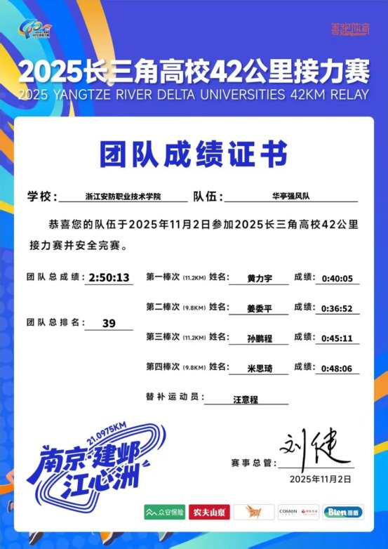 11月2日,我院学子黄力宇和队友姜委平、孙鹏程、米思琦、汪意程组队代表学校出征2025长三角高校42公里接力赛,与上海交通大学、复旦大学、浙江大学等长三角地区高校的近200支队伍同场竞技。经过激烈角逐,我校代表队以2:50:13的成绩勇夺第39名,跻身前五十强,圆满完赛。