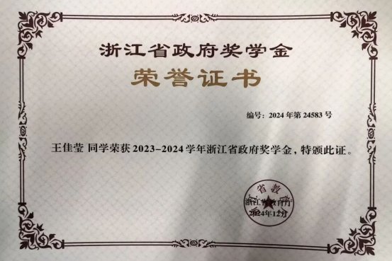 在学习上始终以严谨态度深耕专业领域,秉持刻苦钻研精神探索知识边界。凭借扎实的学习功底与持续努力,综合成绩多次稳居专业首位,不仅荣获浙江省政府奖学金这一省级荣誉,更连续蝉联校级一等奖学金,以实际成果印证学习成效。平日里,积极投身校院各类竞赛,主动挑战自我,同时认真履职奉献,先后获评 “优秀共青团干部”“入党积极分子优秀学员”“优秀志愿者”等称号。在技能提升与竞赛实践中,持续突破:2024年获“挑战杯”校赛二等奖、“互联网 +” 校赛三等奖,考取计算机省二级证书;2025年获电子商务挑战赛校赛二等奖、校级 “小劳模”,考取无人机航拍高级工证书,以多元实践筑牢能力基础。