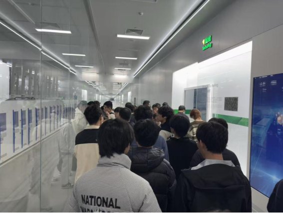 专题讲解结束后,在企业工作人员的有序引导下,同学们前往光伏电池自动化生产车间进行实地参观。车间内,智能化生产线高速运转,机械臂精准操作,从硅片加工到电池成品封装,一系列自动化生产流程一目了然,同学们近距离观察了TOPCon电池的全流程生产过程,直观感受了正泰太阳能在光伏智能制造领域的雄厚实力和严谨的质量管控体系,真切体会到科技赋能光伏产业的强劲动力,也对康老师讲解的工艺知识有了更直观的印证。