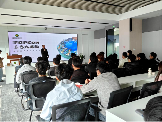 讲解现场,电池工艺主任工程师康忠平老师以“TOPCon工艺大揭秘”为主题,结合自身多年在光伏电池工艺研发与生产管控的丰富经验,用通俗易懂的语言,系统讲解了TOPCon(隧穿氧化层钝化接触)电池工艺的核心知识。他从TOPCon工艺的行业重要性入手,强调其作为当前晶硅光伏市场的主流技术,凭借高效率和良好的规模化制造兼容性,已成为支撑光伏平价上网、推动全球能源低碳转型的核心力量。随后围绕TOPCon电池工艺的基本原理和制作流程展开详解,让同学们清晰理解了其相较于传统电池效率更高、衰减更低的核心优势。